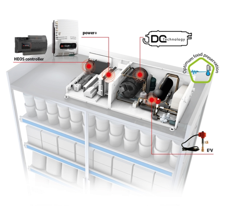 El HEOS es un sistema de unidades autocontenidas en muebles exhibidores condensadas por un circuito de agua; que con la más moderna tecnología (válvulas electrónicas, compresor de velocidad variable, entre otros) genera grandes ahorros energéticos, así como disminución en el consumo de refrigerante hasta en un 80%.